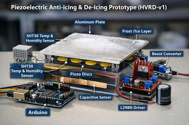Geliştirilen prototip, katmanlı bir yüzey yapısı, mekanik titreşim üreten aktif bir sistem ve çevresel koşulları izleyen sensörlerden oluşmaktadır. Bu yapı sayesinde sistem yalnızca gerekli durumlarda aktif hâle gelerek enerji verimliliği sağlamayı hedeflemektedir. Prototipte, buzun yüzeye tutunmasını azaltmaya yönelik pasif bir üst yüzey ile mekanik titreşim üreten aktif yapı birlikte kullanılmıştır.